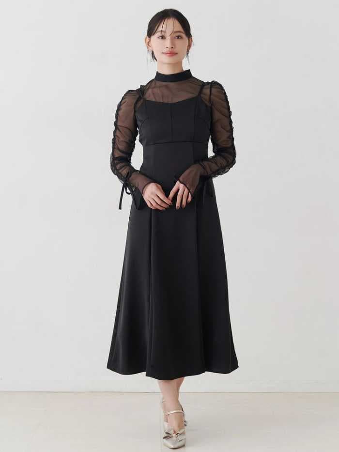 上品なサテンとシアーが魅力!ギャザースリーブワンピース