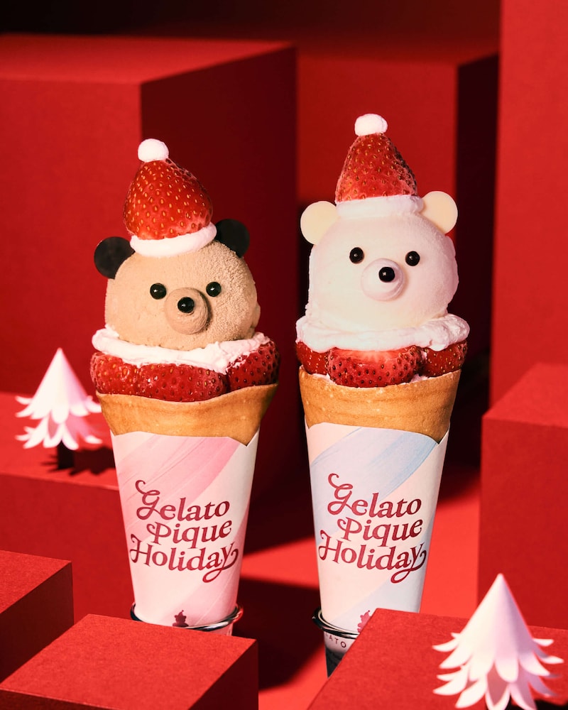 ジャージーミルクジェラート・いちごマーブルジェラート・キャラメルショコラジェラートの3層構造に、ピスタチオホイップをツリーのように絞って、ホリデームードを演出。チョコチップで描かれたベアの顔がのぞく、食べるのがもったいないくらいのキュートさ。