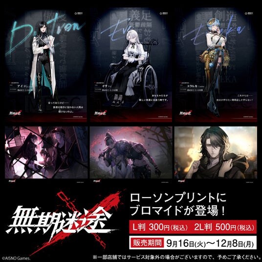 2025年9月16日(火)より、「ローソンプリント」とのコラボを開催したことをお知らせいたします。期間中「ローソンプリント」にて、『無期迷途』公式イラストを使用したビジュアルブロマイド、キャラクターブロマイドを販売いたします。