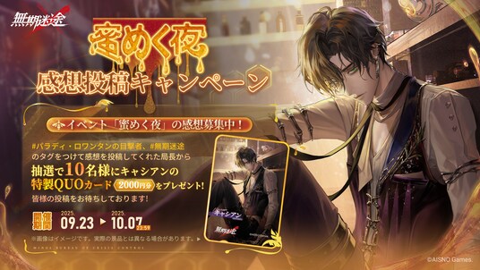 「#パラディ・ロワンタンの目撃者」と「#無期迷途 」2つのタグをつけて、イベントの感想を投稿してくれた方から、抽選で10名様に新キャラクター「キャシアン」の特製QUOカード2,000円分をプレゼントいたします!