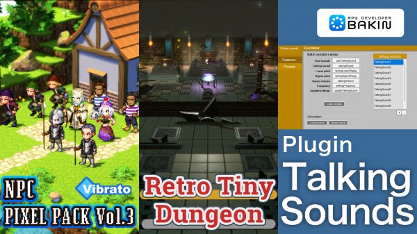 会話イベントにサウンド演出を加えるプラグイン『Talking Sounds』と、標準素材のサポートキャラクターを高解像度で再構築したドット絵キャラクター素材集『Vibrato NPC PIXEL PACK Vol.3』、レトロなローアングル3Dスタイルのダンジョンを構築できるアセットパック『Retro Tiny Dungeon』を発売しました。また、2025年12月11日(木)午前3時まで10%OFFのローンチ割引を実施しています。この機会をお見逃しなく!