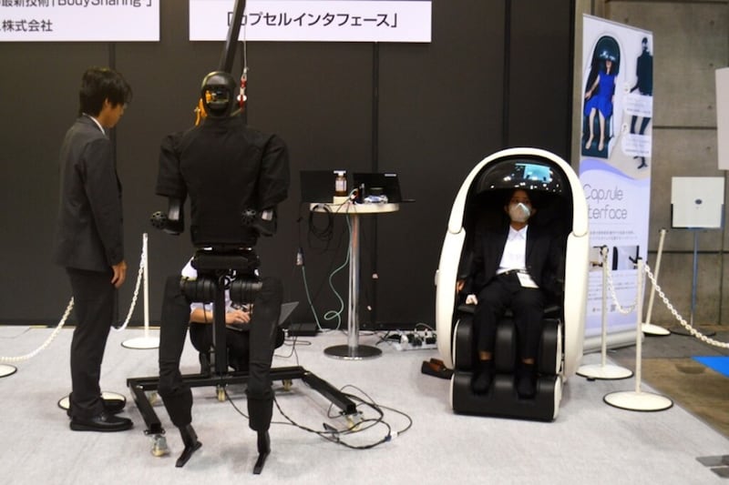 最新技術「BodySharing」によってロボットと感覚を共有し、遠隔地のロボットを操作できる「カプセルインタフェース」。H2L株式会社と琉球大学が共同開発した最新テクノロジーを体験できる。