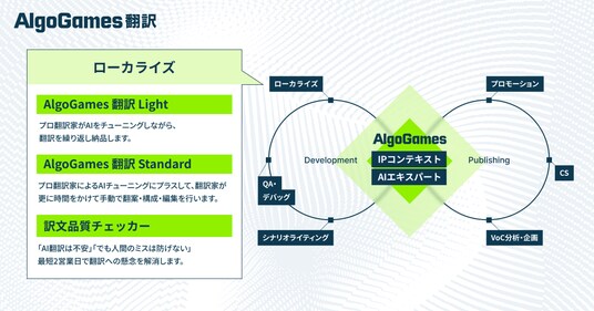 『AlgoGames』シリーズは、最先端の生成AI技術とゲーム業界のプロフェッショナルの協働により、翻訳にとどまらず、マーケティング、シナリオライティング、QA、パブリッシング等、ゲーム開発・運営を包括的に支援するプラットフォームです。生成AIによる高い生産性に加え、作品ごとのデータを活用する独自の強みを武器に、AIの強みである「安さ・速さ」の先にあるクリエイティブ価値を提供。日本発のゲームタイトルが、世界市場で継続的に成功するための開発・運営インフラを目指しています。