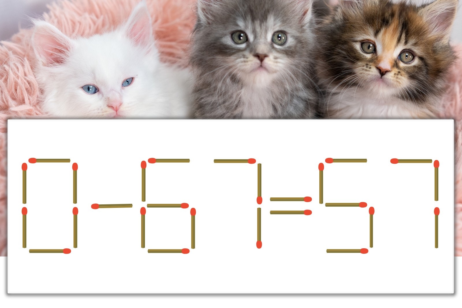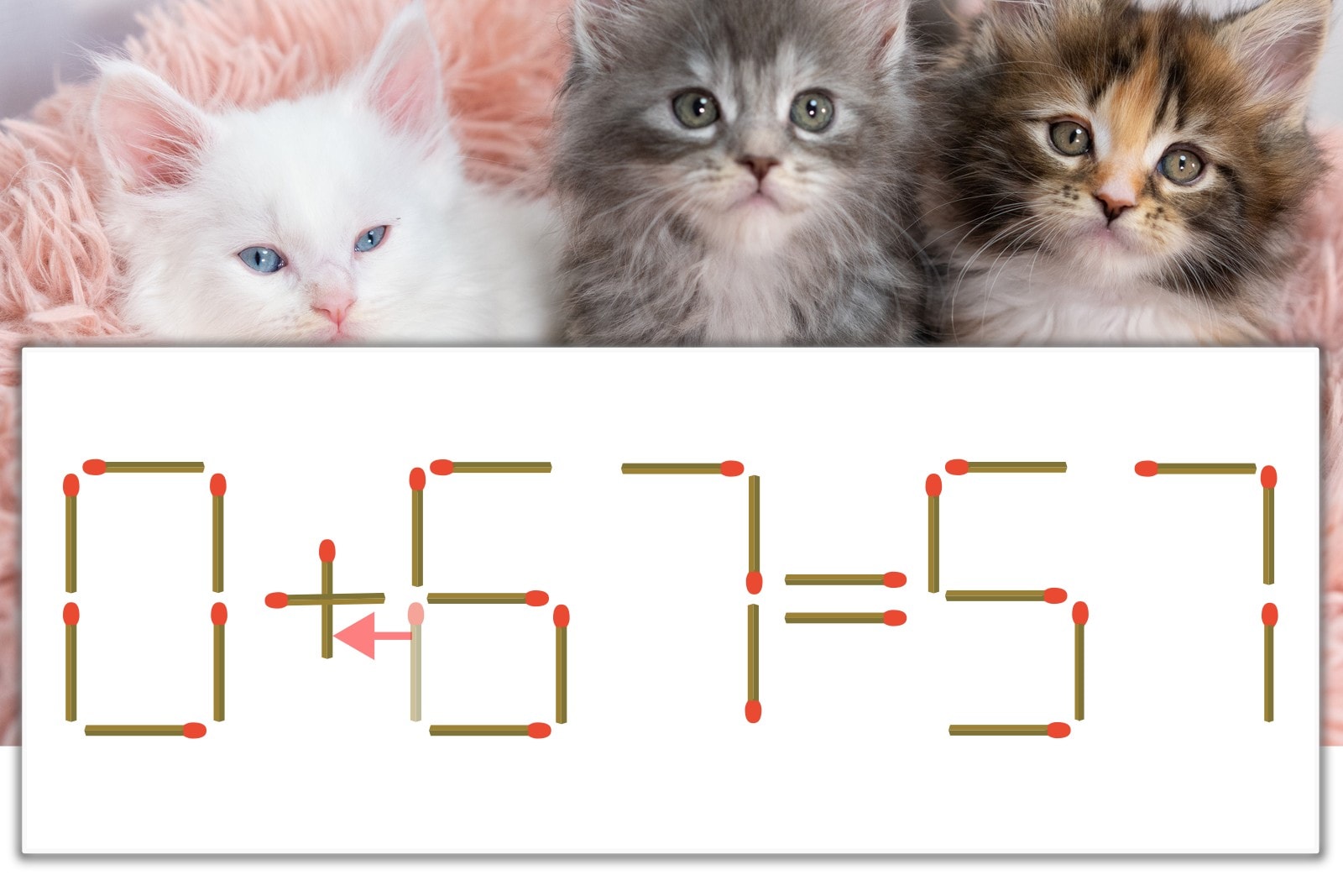 「6」を別の数字に変化させると答えが導き出せます。「6」のマッチ棒を1本移動して、「-」を「+」にしてみましょう。すると、「0+57=57」が成立します。