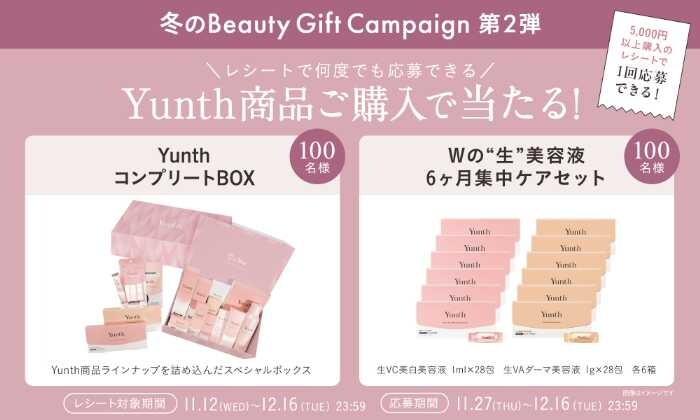 今回のキャンペーンは、2025年11月12日(水)10:00〜12月16日(火)23:59の期間にYunth商品を5,000円(税込)以上購入した方が対象。