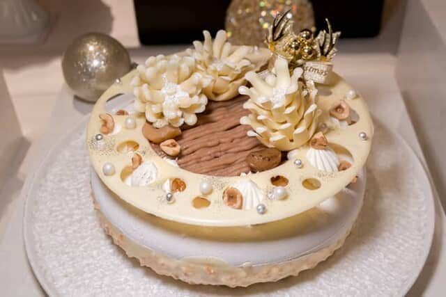 クリスマスリースをかたどった純白のケーキ「スノー・リース」は、キャンディーレモンやコニャックに漬けたマロンなどをトッピング。ホワイトチョコレートでできた松ぼっくりは、深い印象を残す美しさです。