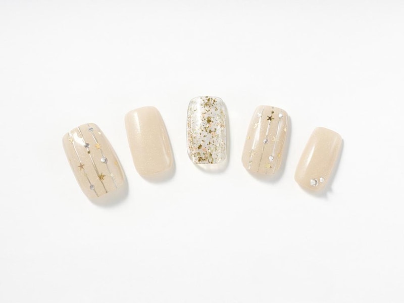 キラキラ舞う風を思わせる小粋な白味グレージュカラー。ゴールドラメとシルバーラメがポイントです。