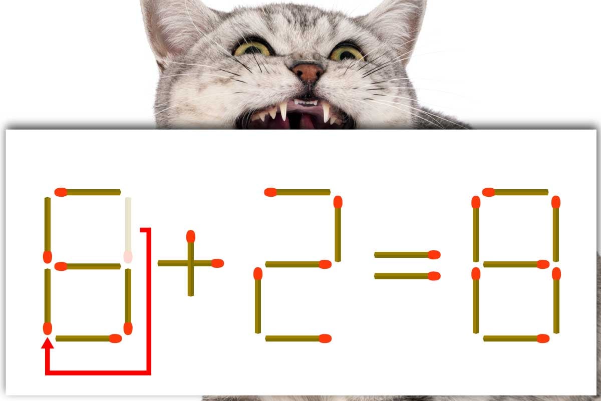 「9」の右上にあるマッチ棒を1本、左下に移動させて「6」を作り、「6+2=8」にする。※解答は複数ある場合があります。