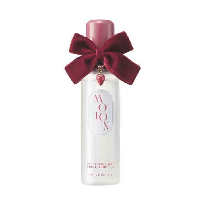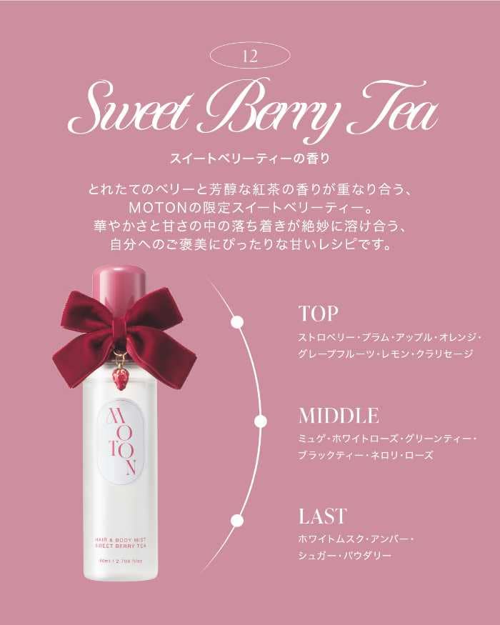 MOTONのヘア&ボディミストから、数量限定フレグランス「SWEET BERRY TEA」が登場♡とれたてのベリーと芳醇な紅茶の香りが溶け合い、トップからラストまで長く上品に香ります。美容成分配合で髪にも体にも使えるミストは、プチプラながら香水のような仕上がり。限定ベロアリボンと苺チャーム付きで、自分へのご褒美やギフトにもぴったりのアイテムです♪