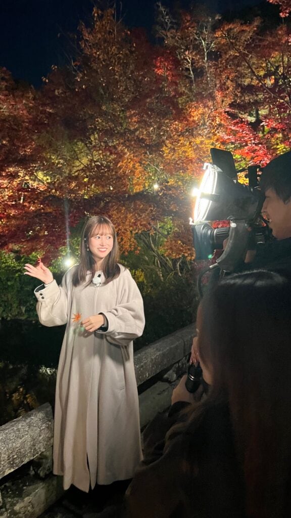 個人的には「おかえり」でもご紹介した、池に映る“逆さモミジ”が非常に幻想的で素敵でした。映像でもうっとりするような景色だったと思いますが、現地で池の端から端までを眺めると、映像とはまた違った感動が生まれます。中継が終わった後、普段はスタッフも含めてすぐに撤収するのですが、今回は終わってからもしばらくの間、みんなで写メをいっぱい撮っちゃいました。
