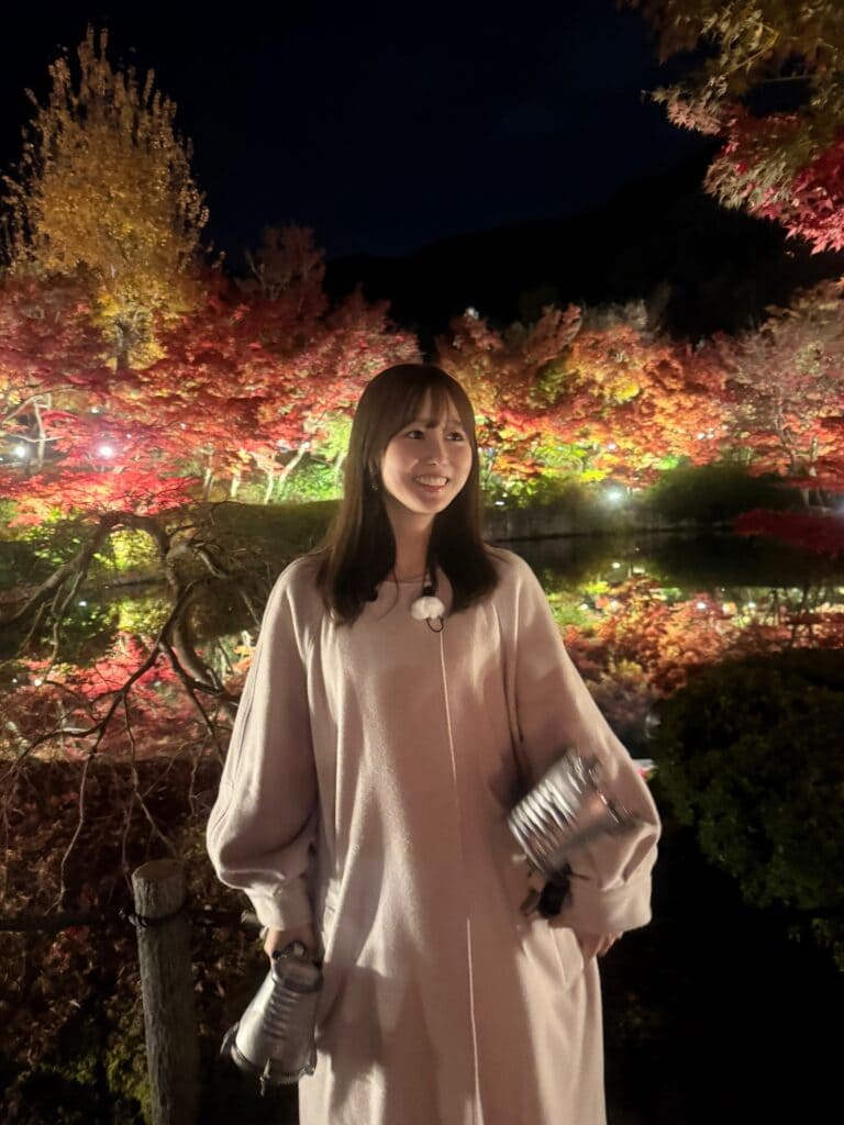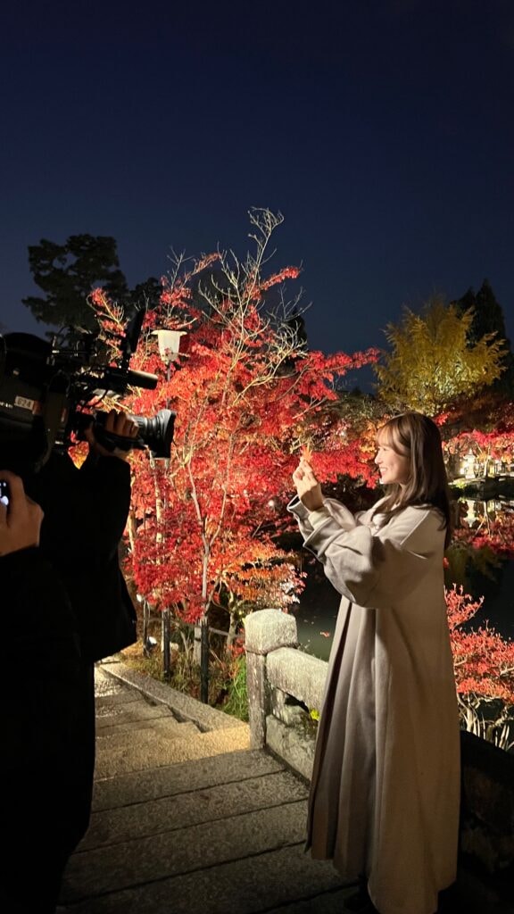 こんにちは、ABCテレビ新人アナウンサーの久保光代です。今回は、「newsおかえり」で、京都屈指のモミジの名所、永観堂 禅林寺から生中継しました。境内では、なんと3000本ものモミジが楽しめるのですが、永観堂 禅林寺は創建が平安初期の853年で、その歴史は1000年を超えるすごい場所なんです。