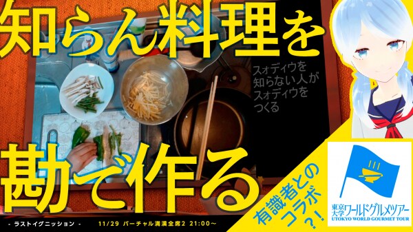 21:00-22:30 「知らん料理を勘で作る」料理人:こな 協力:東京大学ワールドグルメツアー