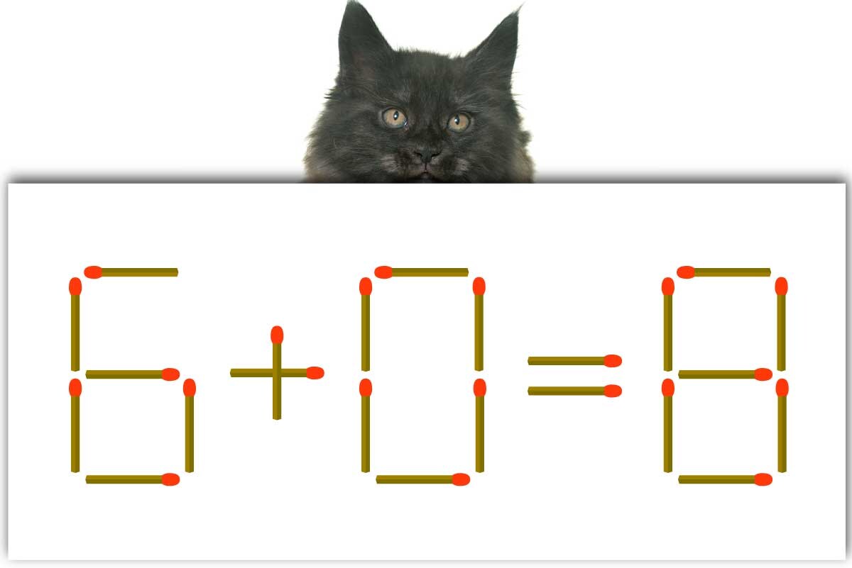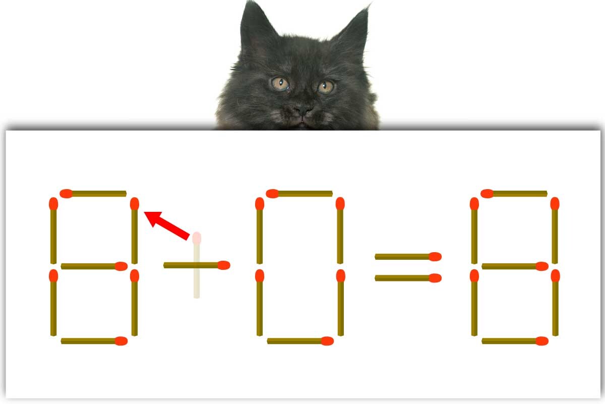 「+」のマッチ棒を1本、「6」に移動させて「8」を作り、「8-0=8」にする。※解答は複数ある場合があります。