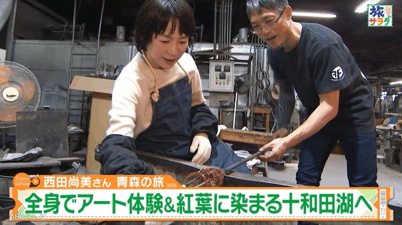 その後、アートが好きな西田は、十和田市では現代美術館で美術鑑賞をし、⻘森市では津軽びいどろの⼯場でガラスのコップづくりを体験。「1日3食麺でも全然いい」ほど麵も大好きなため、地元で人気の⼗割蕎⻨と津軽ラーメンを味わい、大満足で⻘森の旅を締めくくった。