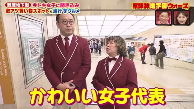 オーサカクレオパトラは、調査前からボケてツッコミまくり! りえちゃんが、「かわいい女子代表じゃないですか、私がね!」と話し出すと、かつのぶさんはすぐに、「どこがやねん! かわいい女子って」とピシャリ。「かわいい女子は(地下街を)こう歩くんだよというのをお伝えしたい」と、りえちゃんがリポートではなくモデルウォークをしだすと、「その“歩き方”かい!」とかつのぶさんは即ツッコんだ。