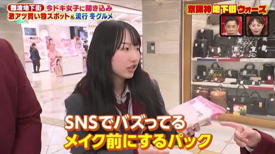 そんなオーサカクレオパトラは、イマドキ女子たちに難波の地下街のおすすめショップとアイテムを聞いてみることに。なんばウォークで、女子高生から「SNSでバズっているメイク前にするパック」を教えてもらったあと、オーサカクレオパトラは自分たちのファンらしき若い女性たちに出会った。