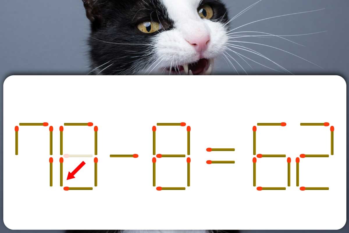 「9」にあるヨコ向きのマッチ棒を1本、タテ向きに回転してから左下に移動させて「0」を作り、「70-8=62」にする。※解答は複数ある場合があります。
