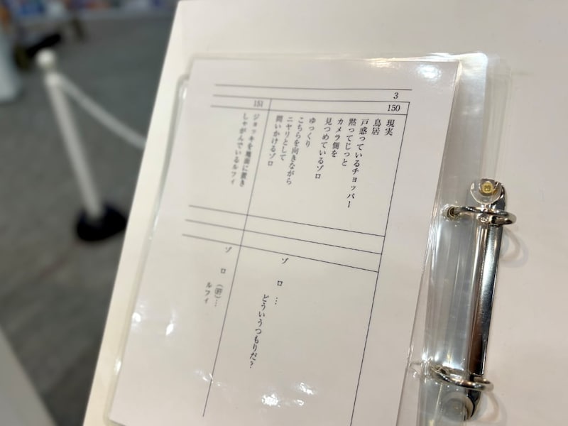 第5章のエリアでは、名シーンに込められた声優の演技を超高音質ヘッドフォンで体験できます。設置された台本を見ながらキャラクターに命を吹き込む声を聞くことで、頭の中でルフィたちが動いているような感覚に。