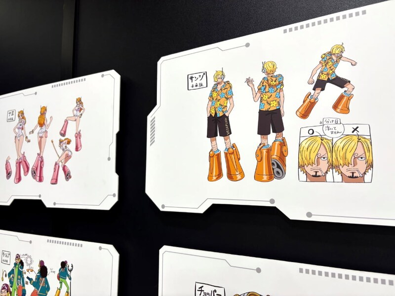 第8章からは「エッグヘッド編」の展示に。「空を飛ぶ!? ルフィの未来服」エリアでは、未来島エッグヘッドで麦わらの一味が着用している“未来服”の詳細を公開しています。各キャラクターの設定資料に加え、“DOMシューズ”の再現オブジェが見られる貴重な展示です。