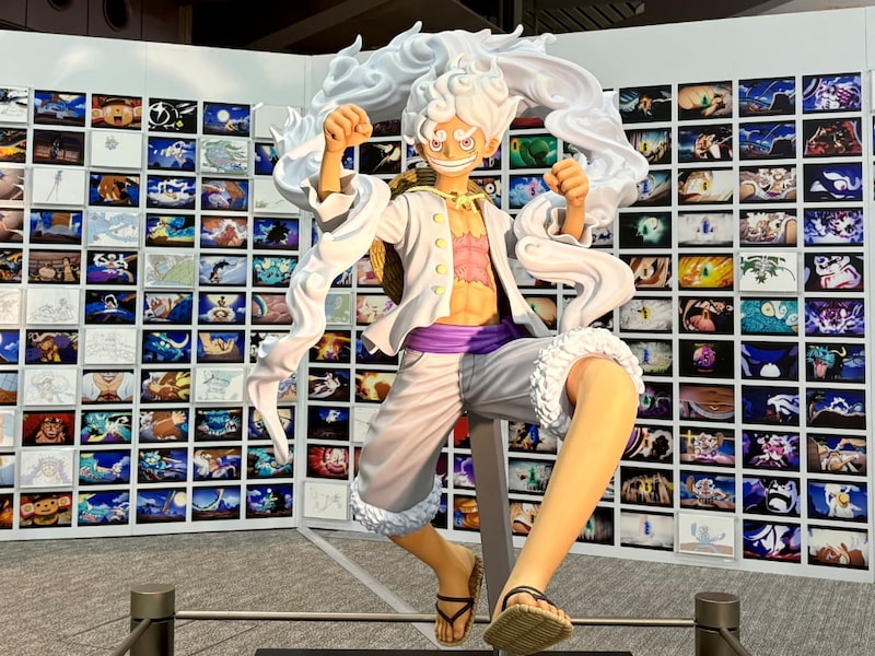 第6章「漫画の表現、アニメの演出」エリアには、太陽の神・ニカ像がお目見え! 「ワノ国編」で“ギア5”の新境地に到達するルフィをどのように演出しているのか、アニメだからこそできる表現をたっぷり見せる展示です。