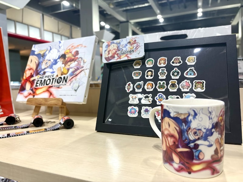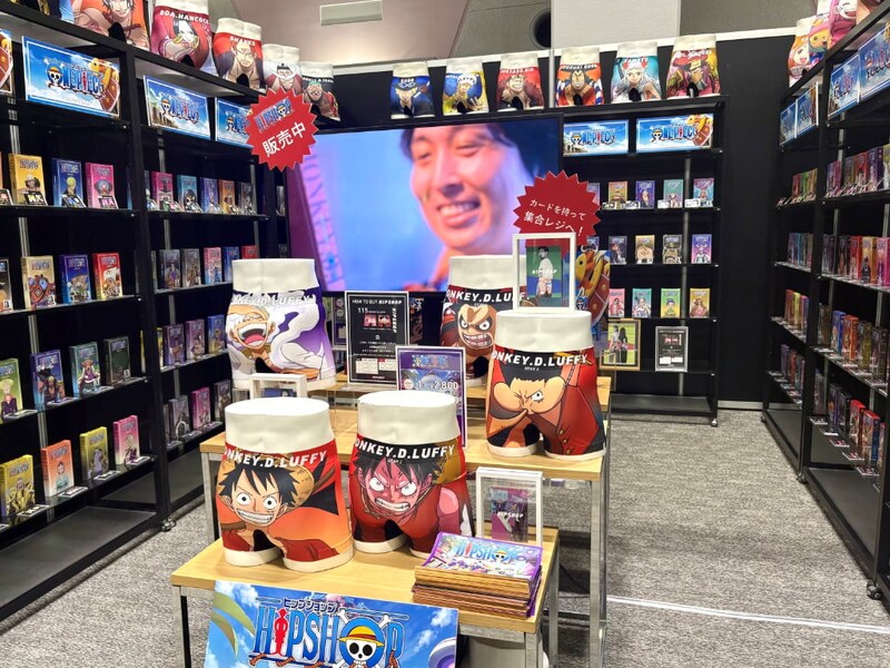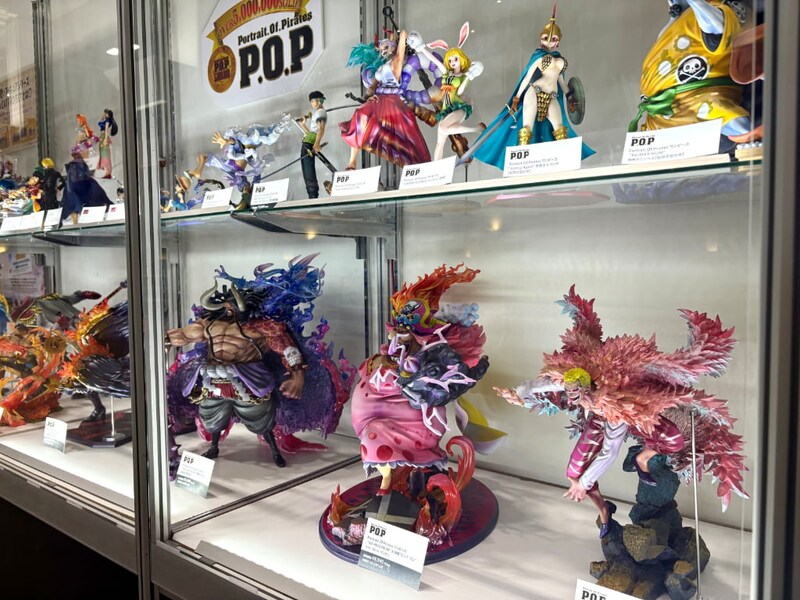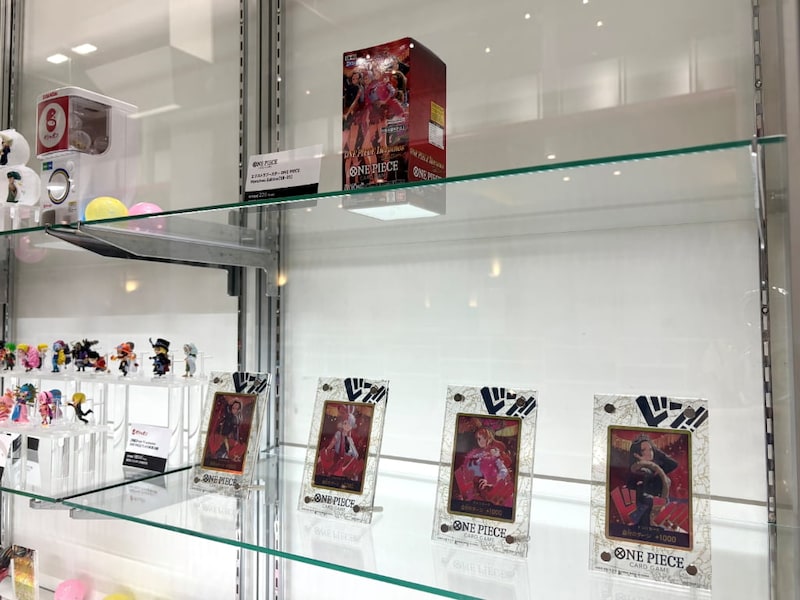 展示会場を出ると、これまで発売された精巧なフィギュアや希少な「ワンピース カード」、アミューズメント景品が並ぶショーケースがありました。ファンにはたまらないレアアイテムばかりです。