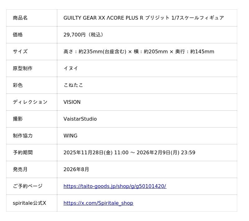 株式会社タイトー(本社:東京都新宿区、以下タイトー)は、魅力的な表情の再現と細部のディテールまでこだわり抜いた高品質キャラクターフィギュアを展開するブランド「spiritale (スピリテイル)」の新商品として、GUILTY GEAR XX ΛCORE PLUS R ブリジット 1/7スケールフィギュアを発売いたします。2025年11月28日(金)11:00より、ECサイト「TAITO GEAR&GOODS」(URL:https://taito-goods.jp/shop/default.aspx)にて予約受付を開始します。