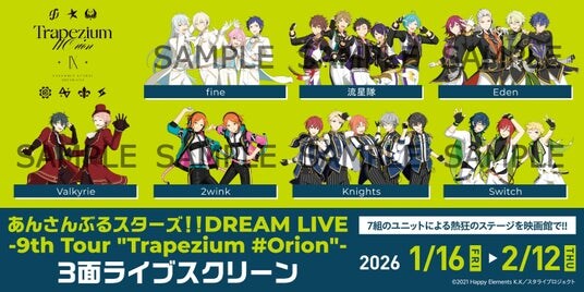 「あんさんぶるスターズ!!DREAM LIVE -9th Tour "Trapezium #Orion"-」3面ライブスクリーンが、2026年1月16日(金)~2月12日(木)の期間、丸の内ピカデリー、MOVIX八尾、MOVIX広島駅、熊本ピカデリーにて公開される。本作では、幕張メッセ公演2日目(11月23日)を3面ライブスクリーンオリジナル編集版で上映。まるで映画館がステージになったかのような大迫力の3面のワイドスクリーンと7.1ch音響が生み出す圧倒的な臨場感に加え、Blu-rayとは異なるユニット、キャラクターによる日替わりMC、公演前、終演後のナレーションも完全収録し“その日だけの特別なステージ”を体験できる。