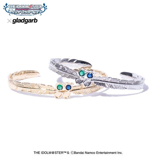 手元にユニットを想起させるジュエリーを提案するMysterious Eyes Bangle。フェザーモチーフのボディにあしらったのは二人のカラーを用いたストーン。gladgarbを表す「gg」の輪郭に落とし込んでコラボレーションならではの特別なデザインを作り上げました。