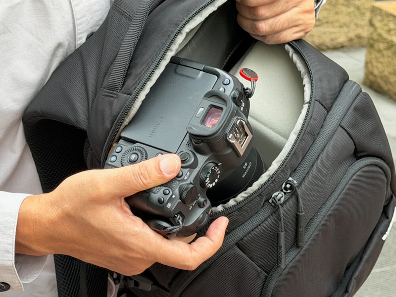 特徴的なのが、この上部にカメラを取り出せるファスナーがあること。実際に使ってみると、取材時にカメラ本体だけをここからパッと取り出せて、とても便利だった。