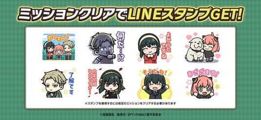 期間中、TVアニメ『SPY×FAMILY』コラボ開催を記念した限定LINEスタンプ(全8種)を配信します。コラボスペシャルステージ1を5回クリアすることで入手が可能です。詳細はゲーム内のお知らせをご確認ください。
