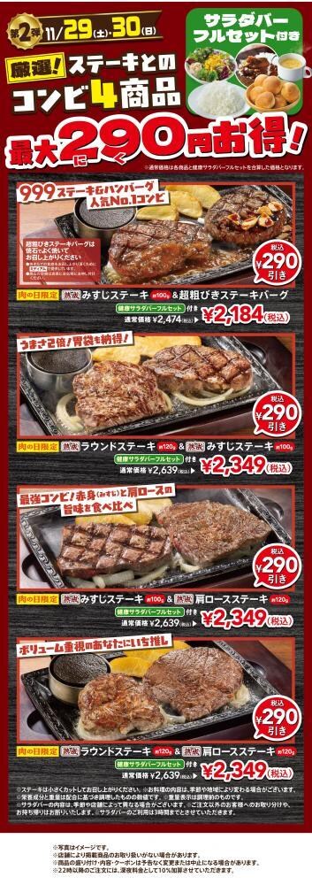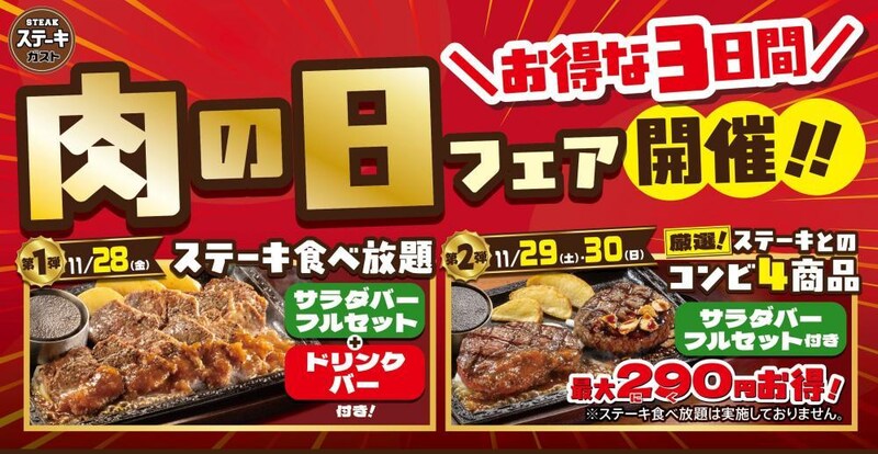 ステーキガストは、2025年11月28日から30日まで、「肉の日フェア」を開催しています。
