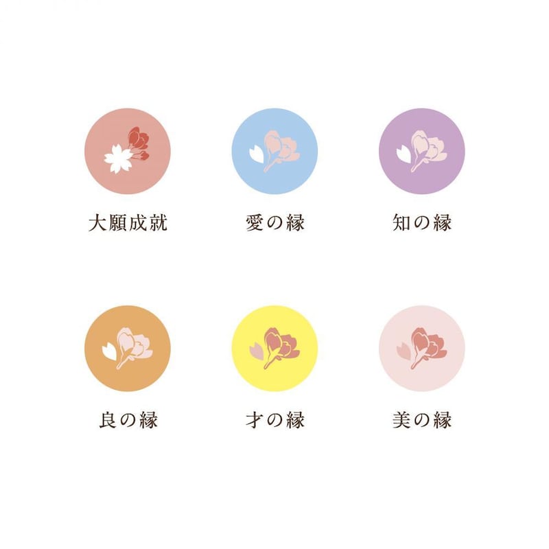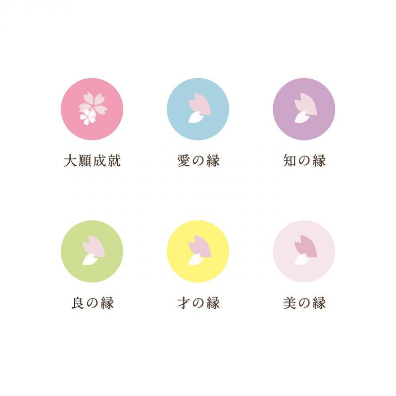 いずれも底面に6種類の"しあわせ桜"の印が入っており、「大願成就」「愛の縁」「知の縁」「良の縁」「才の縁」「美の縁」があり、とくに「大願成就」は入手しにくいレア印となっています。