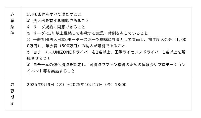 国内で唯一JAF(日本自動車連盟)の公認を受けたeモータースポーツ大会(レーシングゲームを使用したeスポーツ大会)「UNIZONE(ユニゾーン)」を運営する一般社団法人日本eモータースポーツ機構(東京都千代田区、代表理事:出井宏明、以下「JeMO」)は、来年実施するUNIZONE 2026への参戦チームを2025年9月9日(火)~2025年10月17日(金)18:00まで募集します。
