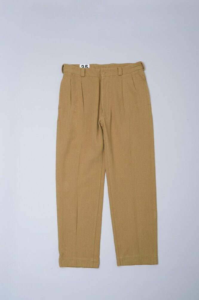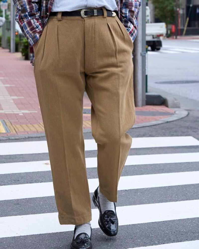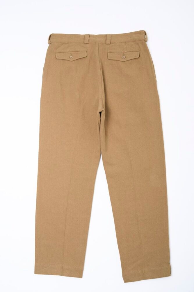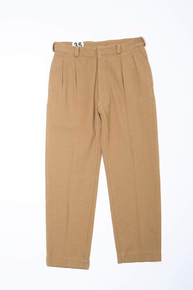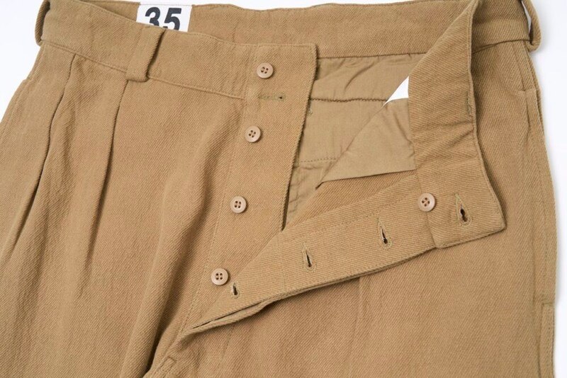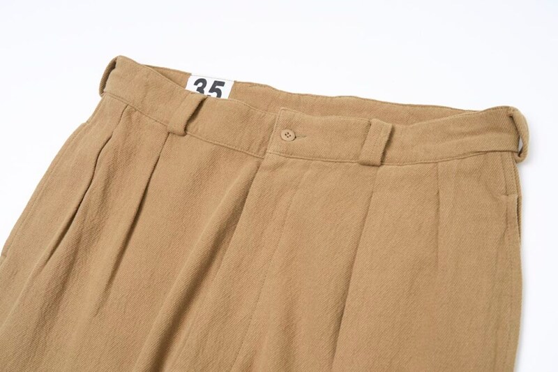 今回の別注のベースとなっているのは、1950〜60年代にフランス軍で使用されていたM-52血のトラウザーズ。最大の特徴は、腰からわたりにかけて余裕を持たせた2タックとテーパードのかかったシルエットだ。軍用品とは思えぬ上品さを醸し、その美しさから名作との呼び声も高い。