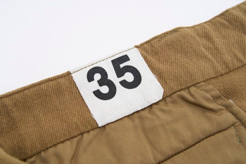 腰の裏部分につく数字のタグもフランス軍特有のサイズ表記を再現したものであり、ミリタリー好きには嬉しい仕様だ。10の位がレングス、1の位がウエストのサイズを示している。