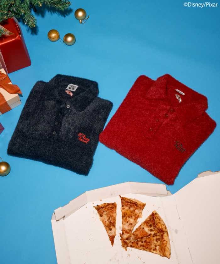 【衿付きニットプルオーバー】(4,990円/フリーサイズ)はBlackとRedの2色。ポロシャツ風デザインにロゴ&ピザアイコン刺繍が施され、カジュアルながら上品な仕上がりに。