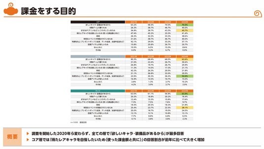 一方、コア層では同時プレイタイトル数が減少傾向でした。「短時間で効率良く進められるが、やり込みは深い」といった、"お金を使って楽しめる要素の充実"で、複数タイトルを並行で進めることが厳しくなりつつあるとも推測できそうです。