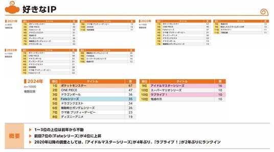 前回7位から4位に順位を上げた「Fateシリーズ」は『Fate/Grand Order』の10周年、圏外からランクインした「アイドルマスターシリーズ」はIP自体の20周年という節目が近いところで様々な展開が行われたことが順位アップに繋がっていると言えそうです。