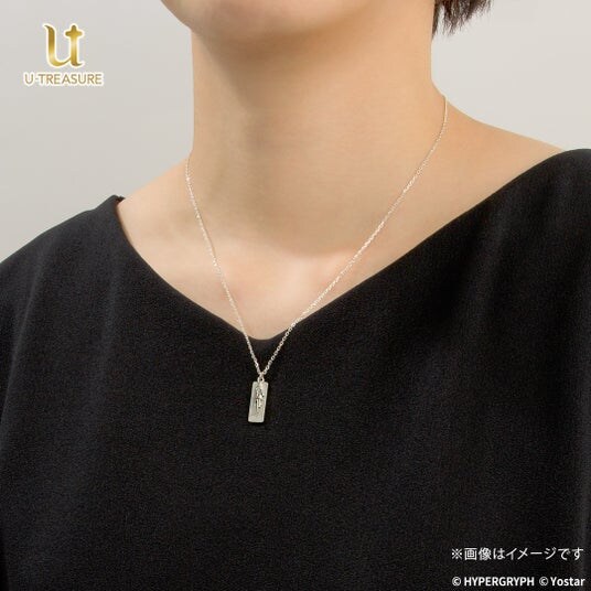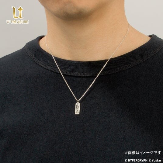 シヴィライト・エテルナの武器をチャームのデザインに落とし込んだプレートネックレス。プレート部分には所属陣営(ロドス)のエンブレムを刻印しました。