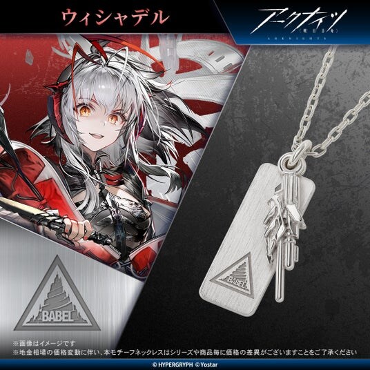 この度の新作は「アークナイツ」のオペレーター「ロゴス」は耳羽を、「ウィシャデル」「シヴィライト・エテルナ」は武器をデザインに落とし込み、所属陣営のエンブレムを刻んだプレートをセットしたネックレスです。日常使いしやすいサイズ感に仕上げました。