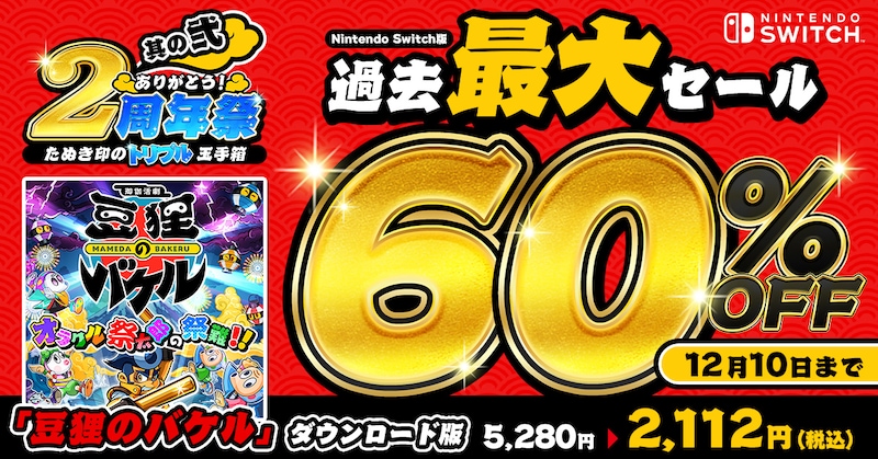 2023 年 11 月 30 日に発売した Nintendo Switch『御伽活劇 豆狸のバケル ~オラクル祭太郎の祭難!!~』もお陰様で発売 2 周年を迎えました!