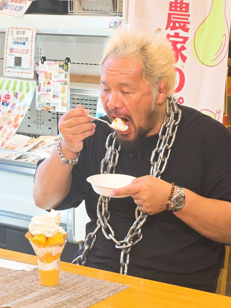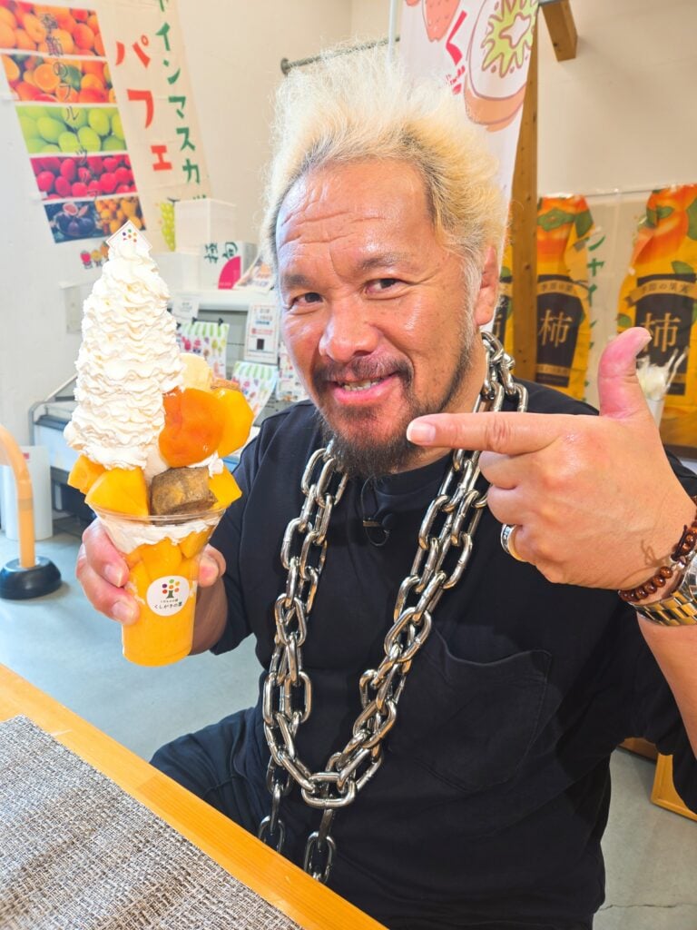 「どんなフルーツたちに出会えるのか楽しみ」と話す真壁さんがやって来たのは、和歌山県かつらぎ町にある「道の駅くしがきの里」。地元の柿をたっぷり乗せた「くだもの農家の柿パフェ」が運ばれてくると、「ハハハ!すごいっすね!」と豪快に喜びの声を上げる。あんぽ柿、刀根柿、甘柿、紀の川柿という4種類の柿が入ったボリューム満点のパフェだ。 まずは地元のブランド柿、紀の川柿を口に入れると「うまい!」とサムズアップし、「食感が固めなんだけど甘みがすごい!」。続いて、和歌山で一番とれる刀根柿を味わった真壁さんは「まろやかで口あたり柔らかいですね。食感も違うし甘さも違う」と個性の違いに驚いた様子。今度は、甘さ控えめのアイスクリームと柿をスプーンに乗せて口に運ぶと、「お互い引き立ててくれるから、めちゃくちゃおいしいですね」と嬉しそう。