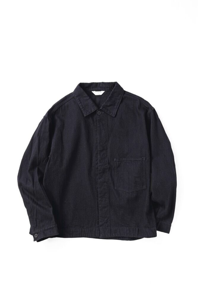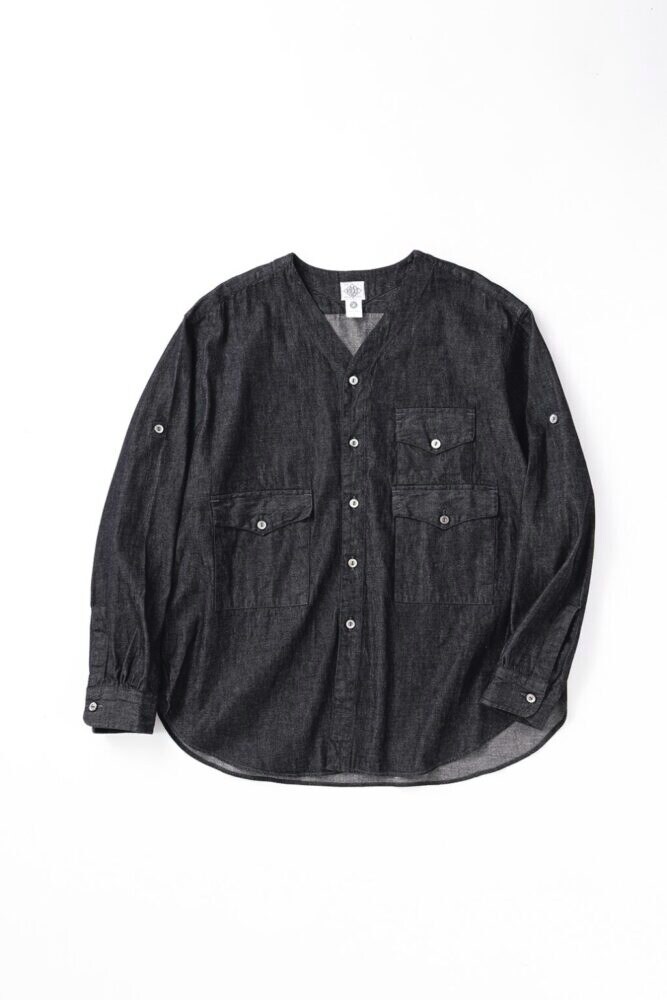 1930年代のハンティングジャケットに着想を得た定番シリーズより、ドレスシャツの縫製で仕立てたレイヤードしやすいノーカラー仕様。4万1800円(ポストオーバーオールズ中目黒TEL03-6303-2160)