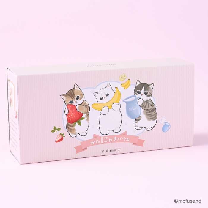 「mofusand」の型ぬきバウムは、可愛らしいスリーブパッケージに入った3個セットも登場。いちご、バナナ、ミルクがそれぞれ1個ずつ入っており、見た目にも華やかです。