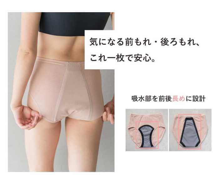 生理の始めや終わり、またはおりものの不安がある時にも、ナプキンと併用することで安心して使用可能です。吸水部が前後に広がっているため、前も後ろも漏れを防ぎ、1日中快適に過ごせます。