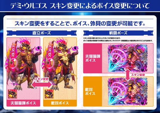 「デミ・ウルゴス」のキャラクターカードのスキン変更をすると、一部ボイスを変更することができます。