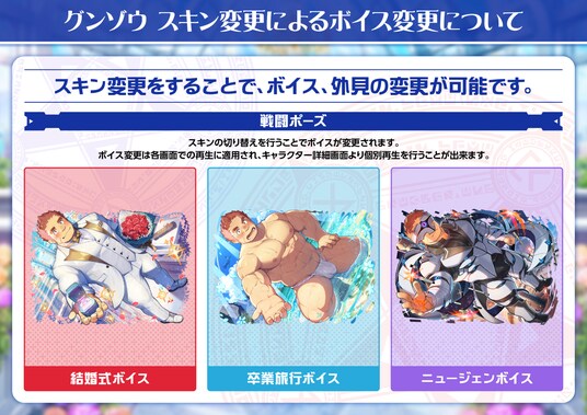 「グンゾウ」のキャラクターカードのスキン変更をすると、一部ボイスを変更することができます。