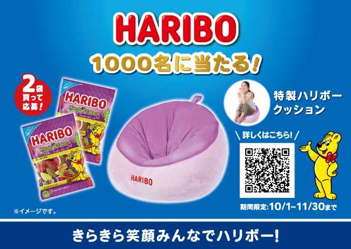 リニューアルを記念して、10月1日~11月30日まで特別キャンペーンを開催。対象期間中に「ハッピーグレープ」を含む2袋を購入した方の中から抽選で1000名様に、特製ハリボークッションが当たります。