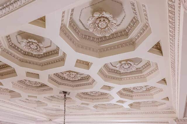 中央にある天窓を取り囲むように天井は漆喰と石膏で構成。特徴的な八角形の中心には同じく石膏で作られた花飾りが施され、繊細なデザインは息をのむ美しさです。