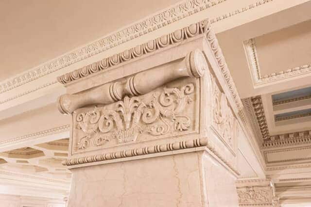 館内の柱は古代ローマ時代に確立され、現代も制作される石造りの建築様式を採用。イタリア産の大理石で作られた柱は、吹き抜け部分は優しい意匠のイオニア式、2階回廊の壁側にある柱はシンプルなトスカナ式の装飾です。